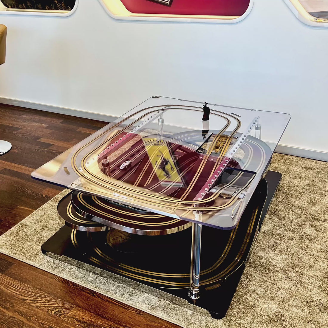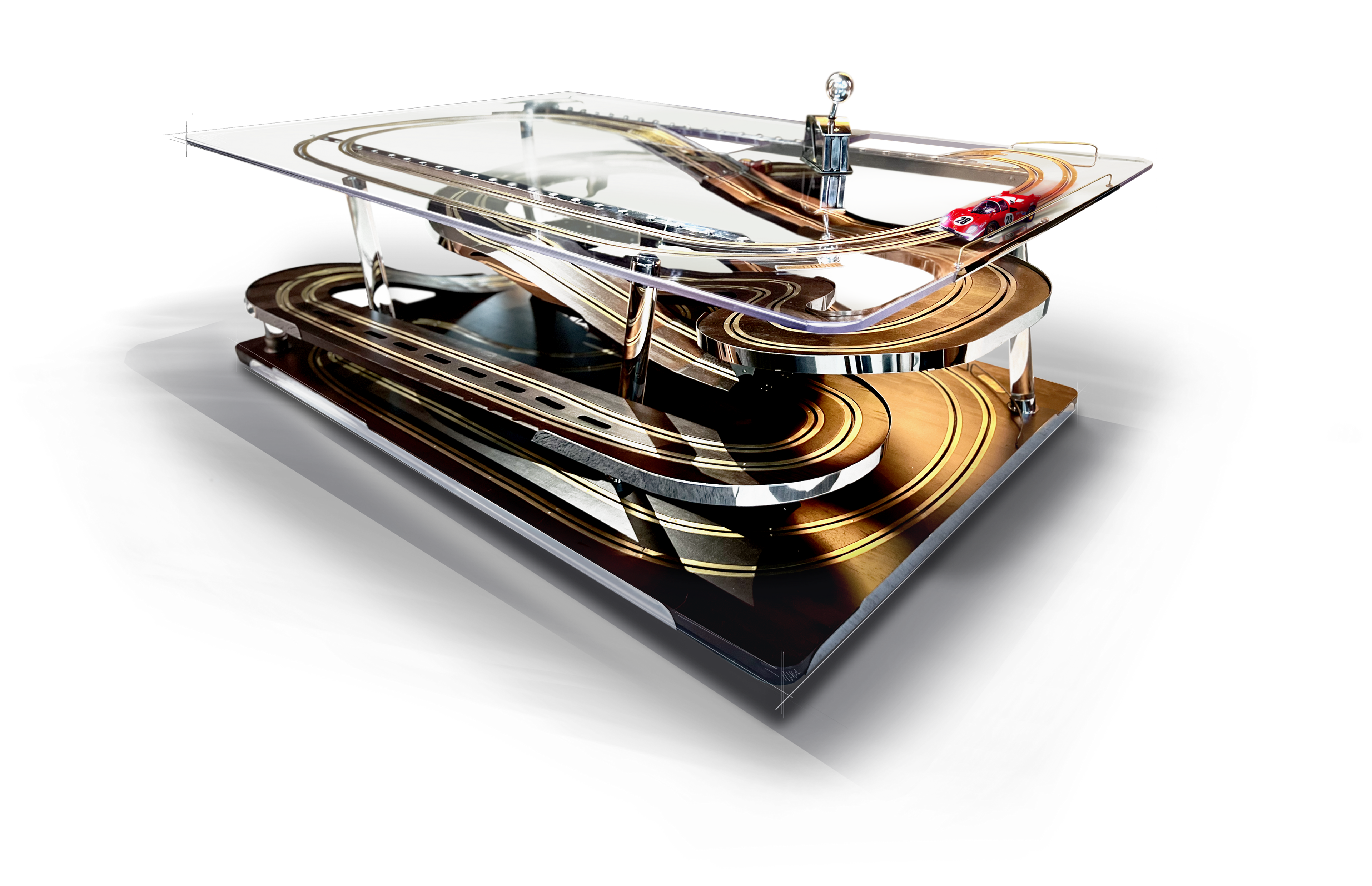 Sous l’élégance sobre d’une table contemporaine se cache une véritable expérience. Intégrant un circuit miniature de 13 mètres répartis sur quatre niveaux, cette œuvre transforme un meuble du quotidien en terrain de jeu interactif. Le plateau usiné laisse passer les voitures, qui grimpent, descendent et animent l’espace.