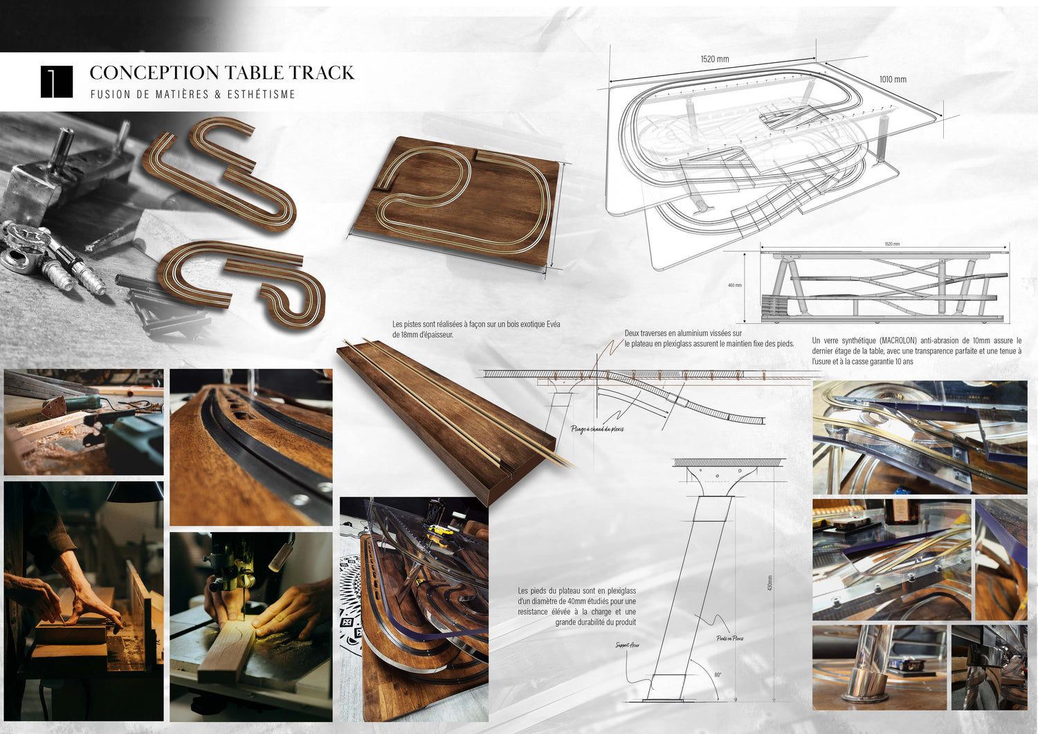 Un assemblage de bois exotique massif associé à des pistes en acier formé et laitonné à chaud, le tout dans un design aérien et élégant, plus qu'un mobilier d'Art les Tabletrack participent à un moment d'émerveillement indiscutable et de jeux sans pareil.