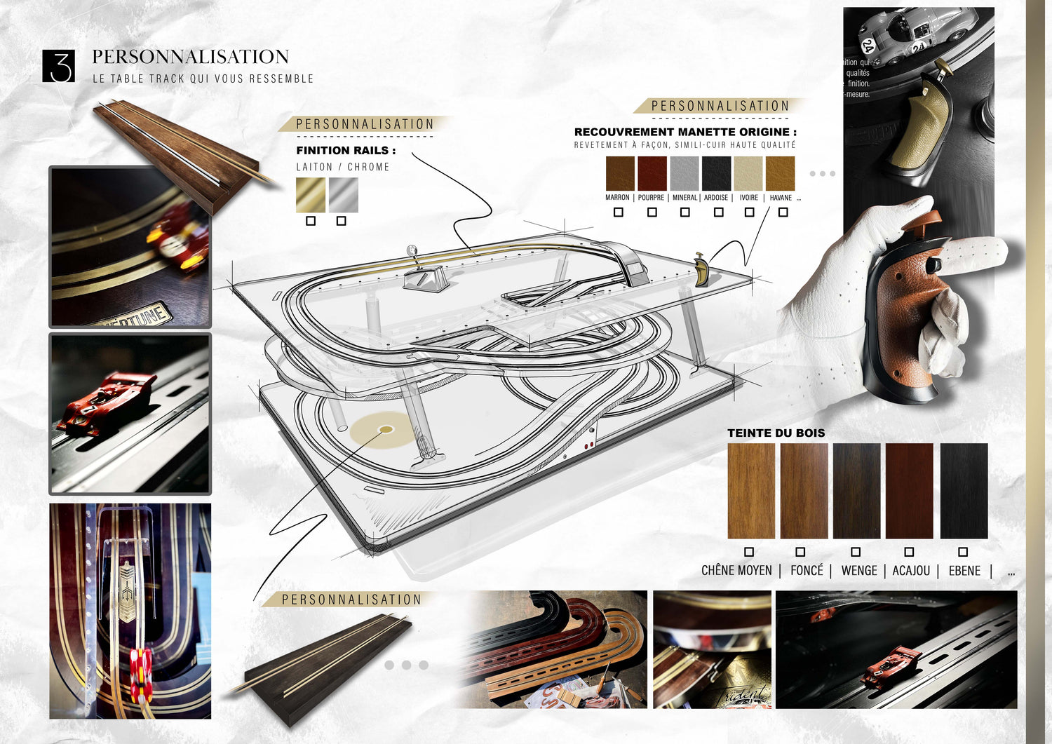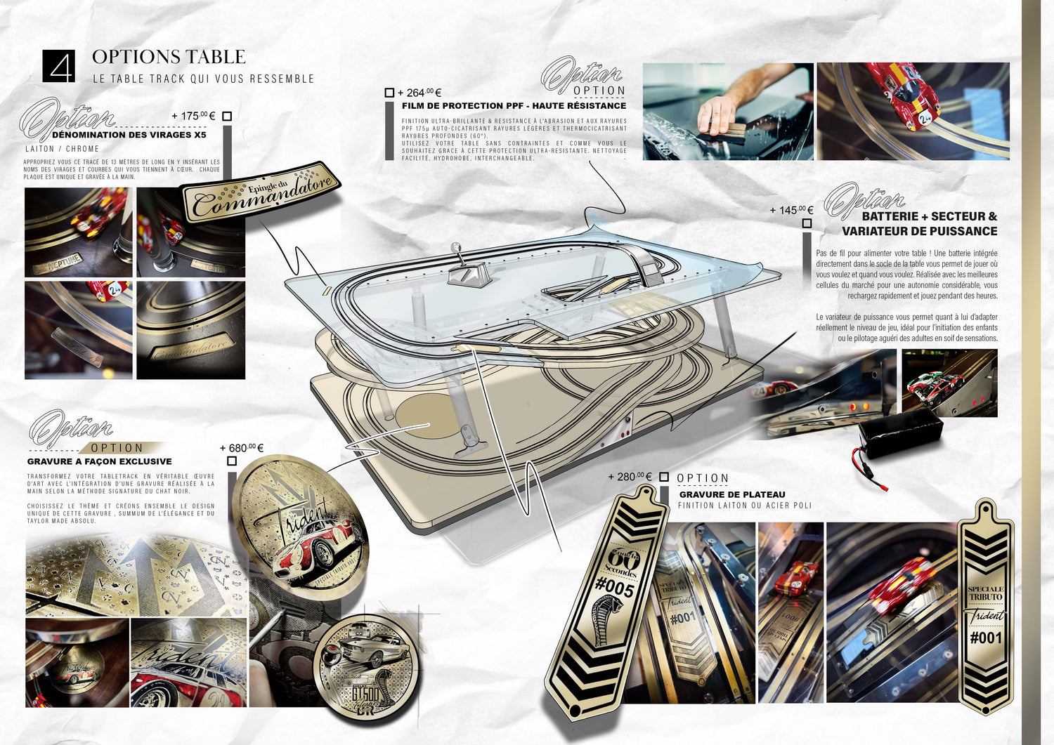 Les Tabletrack intègrent des zones de personnalisation extrême, avec la dénomination des virages de la table, mais également des gravures qui définissent le thème global de cet objet d'Art, des versions Bugatti, Aston Martin ou encore 1000 Miglia ont déjà été réalisées pour le plus grand plaisir de leurs propriétaires.