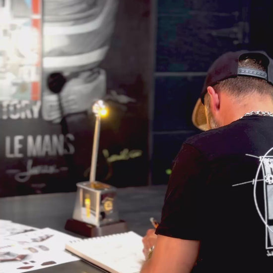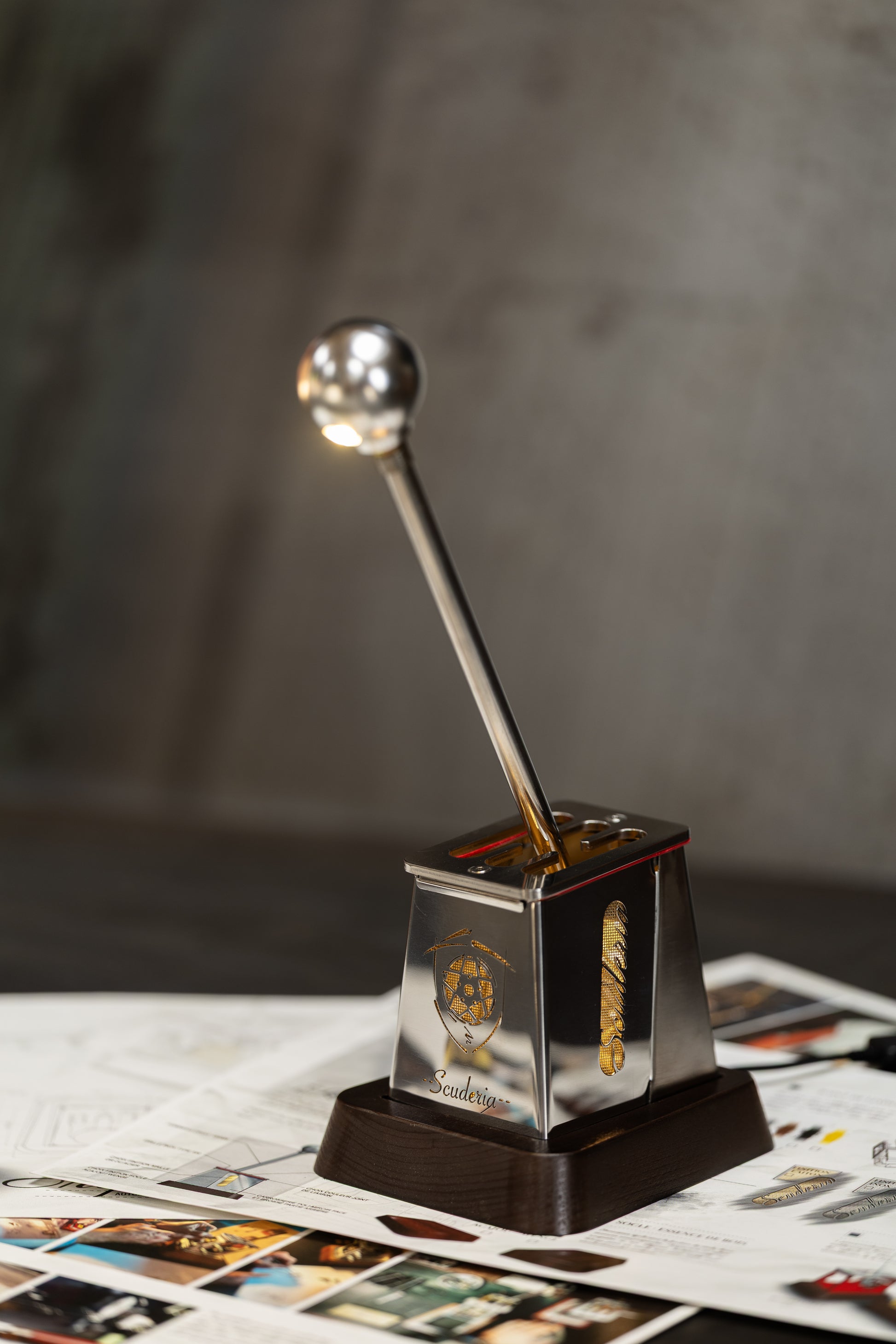 Et si la lumière se pilotait comme une voiture de course ? Cette pièce unique détourne le geste mythique du changement de vitesse Ferrari pour en faire l’interrupteur d’une lampe de bureau. Un mouvement précis, un clic métallique, et l’espace s’illumine.